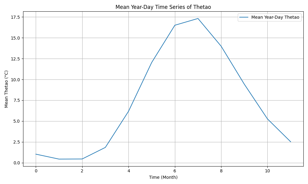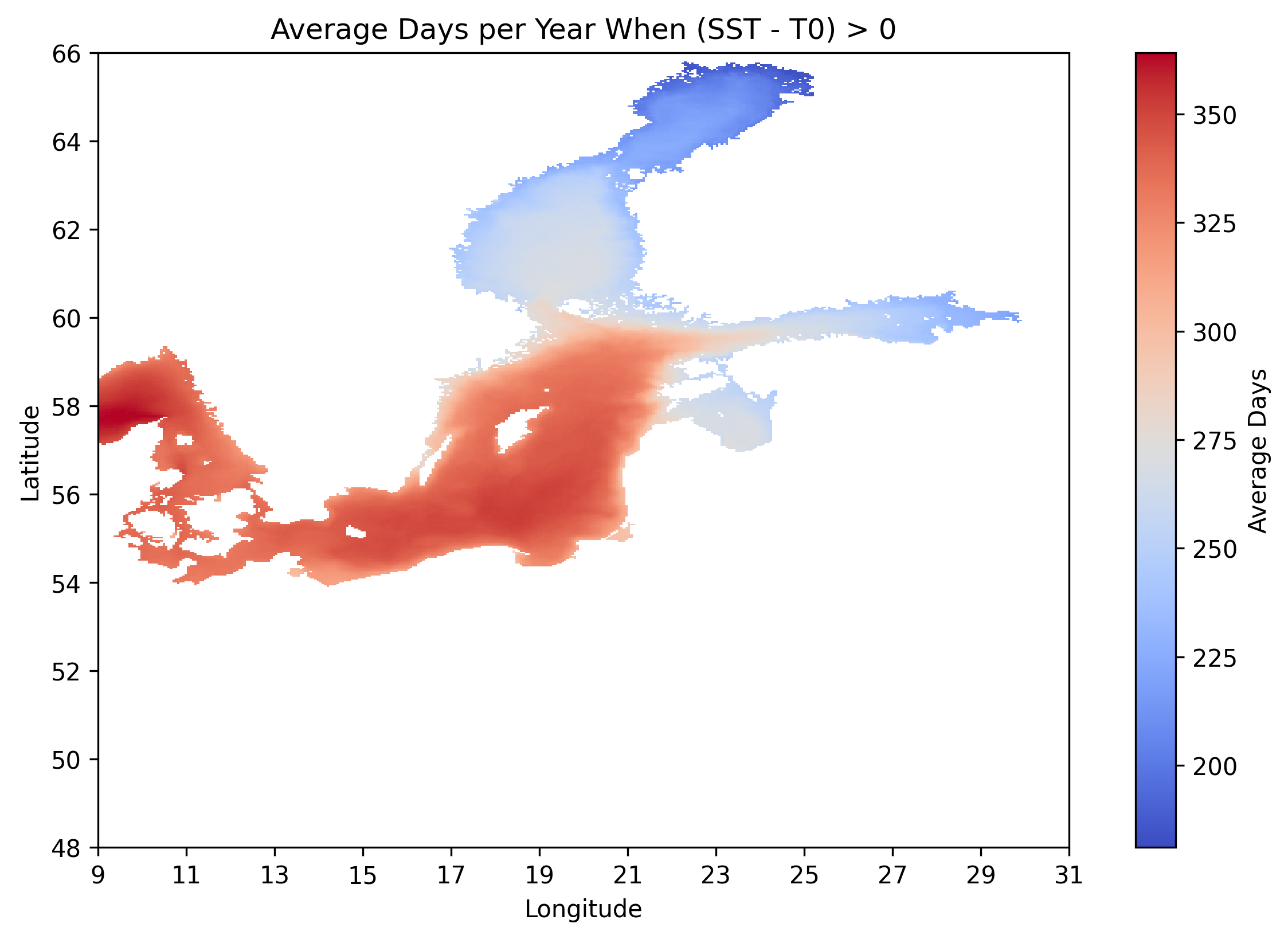 My reanalysis focuses on the Gulf in Finland with coordinates 58°34′00′′N, 60°45′00′′N, 21°56′00′′E, 30°20′00′′E on years 1993-2003. Extracted variables are coordinate variables, time and thetao at a depth of 1.5013654m. Mean yearday time series and average days when (SST > 0) are ploted